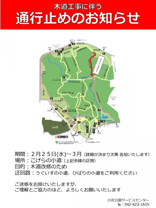園内工事に伴い、下記の期間、小宮公園の一部園路を通行止めとさせていただきます。
